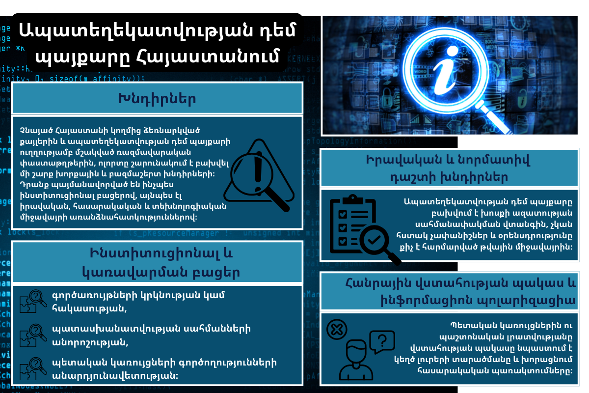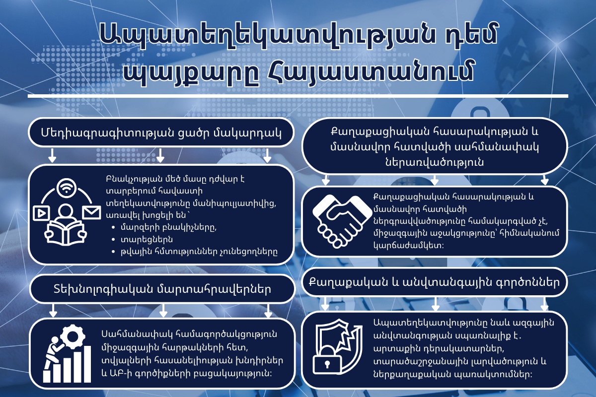 Չնայած Հայաստանի կողմից ձեռնարկված քայլերին և ապատեղեկատվության դեմ պայքարի ուղղությամբ մշակված ռազմավարական փաստաթղթերին, ոլորտը շարունակում է բախվել մի շարք խորքային և բազմաշերտ խնդիրների։ Դրանք պայմանավորված են ինչպես ինստիտուցիոնալ բացերով, այնպես էլ իրավական, հասարակական և տեխնոլոգիական միջավայրի առանձնահատկություններով։