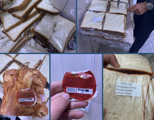 Մասնավորապես՝ ժամկետանց են եղել հետևյալ մթերքները. «Աթենք» արտադրատեսակի կիսաապխտած մսային արտադրանք (արտադրված 03․09․2025թ․, պիտանի է 17․09․2025թ․), տոստի հաց (արտադրված 27․09․2025 թ․, պիտանի է 30․09․2025թ․), պաստերիզացված կաթ (արտադրված 03․09․2025թ․, պիտանի է 30․09․2025թ․)։