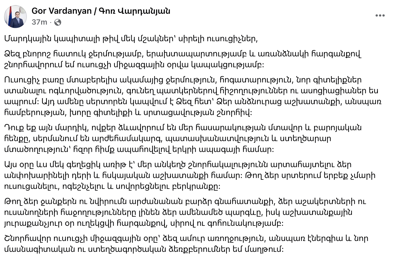 Շնորհավոր ուսուցչի միջազգային օրը՝ ձեզ ամուր առողջություն, անսպառ էներգիա և նոր մասնագիտական ու ստեղծագործական ձեռքբերումներ եմ մաղթում»,- ասված է գրառման մեջ։