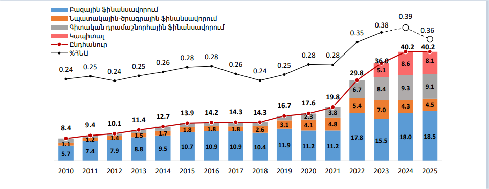 Նախագծի 2․1՝ Կառավարում և ֆինանսավորում հատվածում նշվում է՝ «Գիտական և գիտատեխնիկական գործունեության ոլորտի պետական ֆինանսավորման ծավալները 2010 թվականից գրանցել են որոշակի աճ` 2015 -2018 թվականներին հասնելով 13-14 մլրդ ՀՀ դրամի սահմաններին, ինչը տատանվել է ՀՆԱ-ի 0.24%-0.28%-տիրույթում: Գիտական և գիտատեխնիկական գործունեության ոլորտի պետական ֆինանսավորման ծավալները 2019-20 21 թվականներին բացարձակ արժեքով աճել են` 16.7 մլրդ ՀՀ դրամից մինչև 19.8 մլրդ ՀՀ դրամ` կազմելով համախառն ներքին արդյունքի (ՀՆԱ) համապատասխանաբար 0.25 և 0.28 տոկոսները: 2022 թվականից, համապատասխան Հայաստանի Հանրապետության կառավարության 2021-2026 թվականների ծրագրի, մեկնարկել է պետական բյուջեով հետազոտությունների և մշակումների ոլորտային ֆինանսավորման կտրուկ ավելացման գործընթացը, որն իրականացվել է թիրախային մի շարք ուղղություններով: 2022 թվականին հատկացվել է 29.78 մլրդ դրամ, որը նախորդ տարվա համեմատ ընդհանուր ծրագրերի մասով աճել է 50.4%-ով` տվյալ տարվա համար կազմելով ՀՆԱ 0.38 %: 2023 և 2024 թվականներին ոլորտում պետական ներդրումների ծավալը շարունակել է ավելանալ, այդ թվում ՝ 2023 թվականից առաջին անգամ առանձին միջոցառումներով ոլորտում կապիտալ ներդրումների իրականացմամբ, այդպիսով 2018 թվականի նկատմամբ 2025 թվականին գրանցելով ոլորտին հատկացումների 2.8 պատիկ կամ 181% ավելացում»։