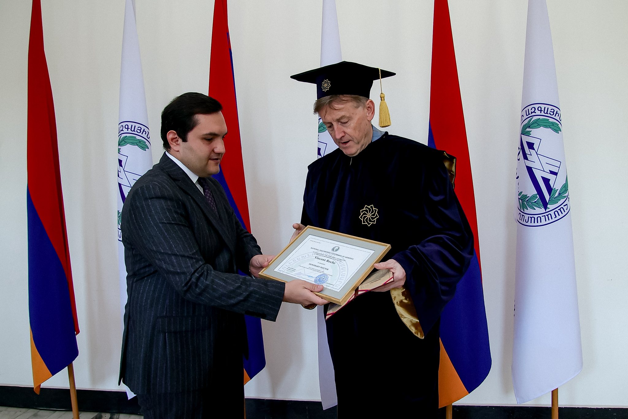 «Այսօր «Հայաստանի ազգային պոլիտեխնիկական համալսարան» հիմնադրամում Analog Devices Inc. (ADI) ընկերության գլխավոր գործադիր տնօրենը և տնօրենների խորհրդի նախագահ, բարձր տեխնոլոգիաների ոլորտում ունեցած ներդրման համար 2025 թվականի ՀՀ պետական մրցանակի դափնեկիր Վինսենթ Ռոշը, Հայաստանի ազգային պոլիտեխնիկական համալսարանի Գիտական խորհրդի որոշմամբ, պարգևատրվել է ՀԱՊՀ պատվավոր դոկտորի կոչմամբ»,- ասված է գրառման մեջ։