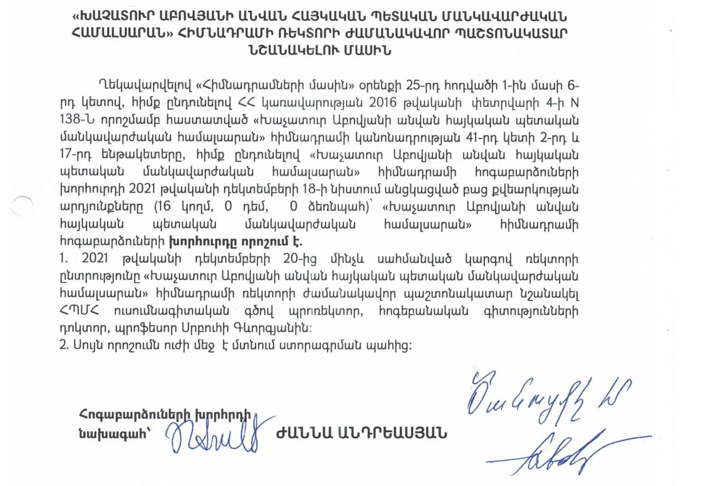Հետագայում, 2021թ. դեկտեմբերի 18-ին կայացած Հոգաբարձուների խորհրդի նիստում (Որոշում N7), որը ստորագրված է եղել խորհրդի նախագահ Ժաննա Անդրեասյանի կողմից, որոշվել է 2021թ. դեկտեմբերի 20-ից մինչև սահմանված կարգով ռեկտորի ընտրելը, ՀՊՄՀ ռեկտորի ժամանակավոր պաշտոնակատար նշանակել Սրբուհի Գևորգյանին: