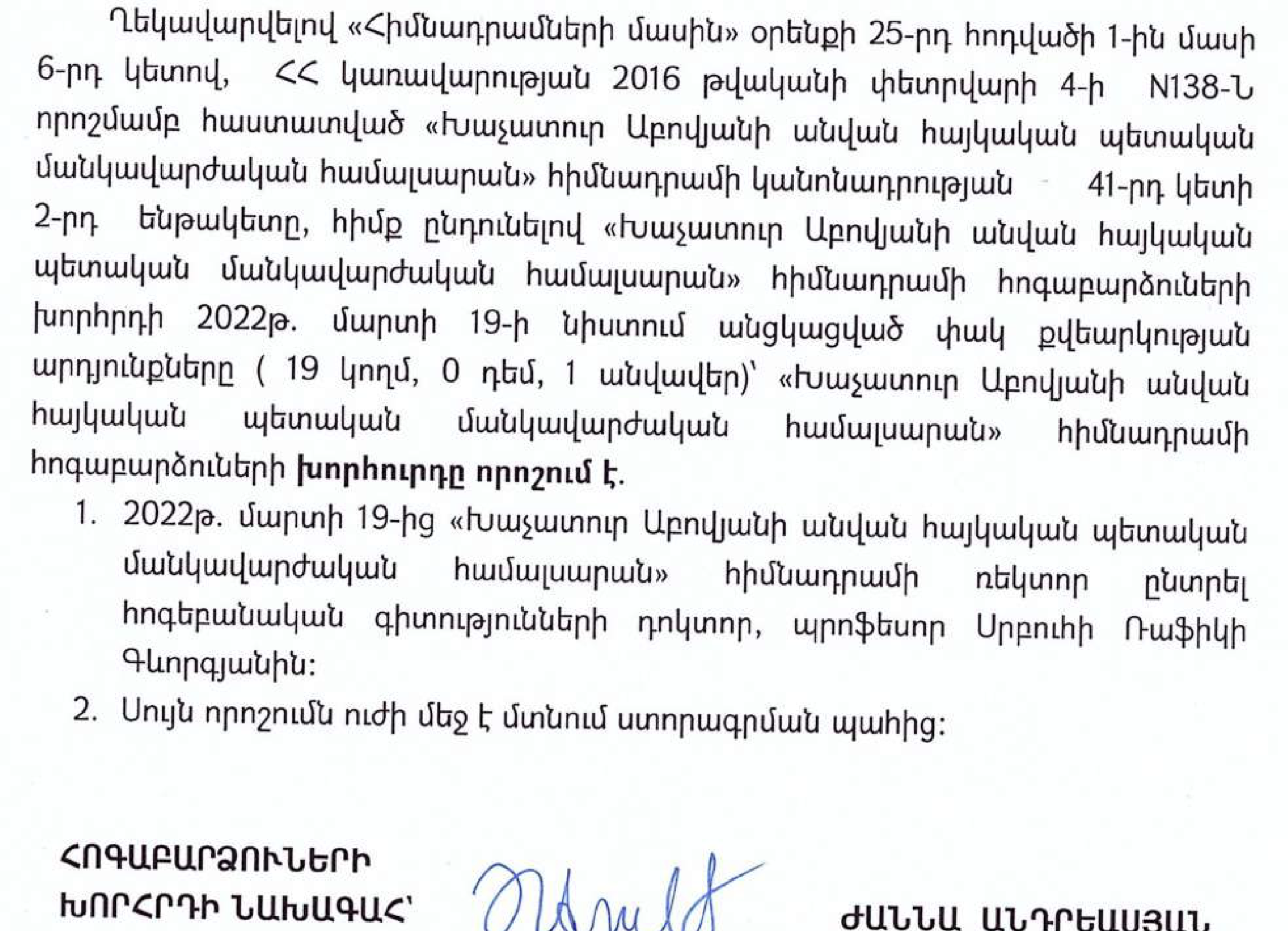 Խորհրդի հաջորդ՝ 2022թ. մարտի 19-ի նիստում (Որոշում N14), որը նույնպես ստորագրված է եղել Ժաննա Անդրեասյանի կողմից, որոշվել է 2022թ. մարտի 19-ից ՀՊՄՀ ռեկտոր ընտրել Սրբուհի Ռաֆիկի Գևորգյանին: