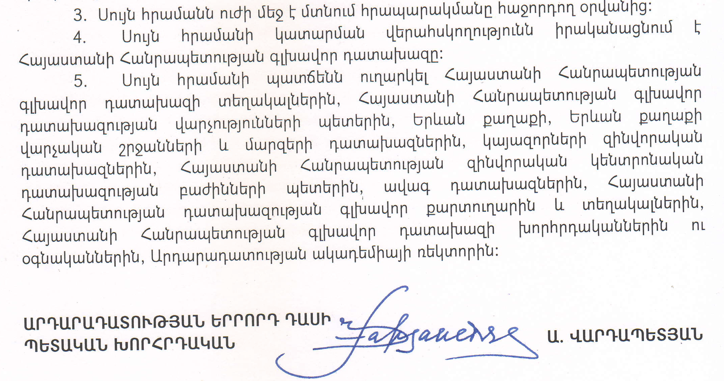 Հրամանն ուժի մեջ է մտնում հրապարակմանը հաջորդող օրվանից, իսկ դրա կատարման վերահսկողությունն իրականացնելու է ՀՀ գլխավոր դատախազ Աննա Վարդապետյանը: Հրամանի պատճենն ուղարկվել է ՀՀ գլխավոր դատախազի տեղակալներին, վարչությունների պետերին, Երևան քաղաքի և վարչական շրջանների ու մարզերի դատախազներին, կայազորների զինվորական դատախազներին և այլ պաշտոնատար անձանց,- տեղեկացնում է Iravaban.netը։