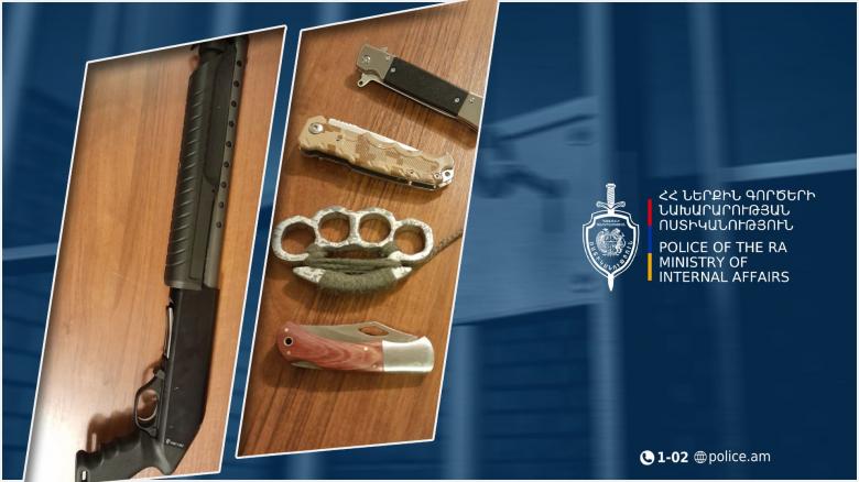 Արթիկի համայնքային ոստիկաններն ու մարզի պարեկները նույն օրը Անկախության հրապարակում ստուգման նպատակով կանգնեցրել են «ԲՄՎ» մակնիշի մի մեքենա: Արթիկցի 18-ամյա վարորդը ոստիկաններին է ներկայացրել կռփազենք և 2 ծալովի դանակ: Երկու դեպքով էլ կազմված փաստաթղթերը ներկայացվել են նախաքննական մարմին։