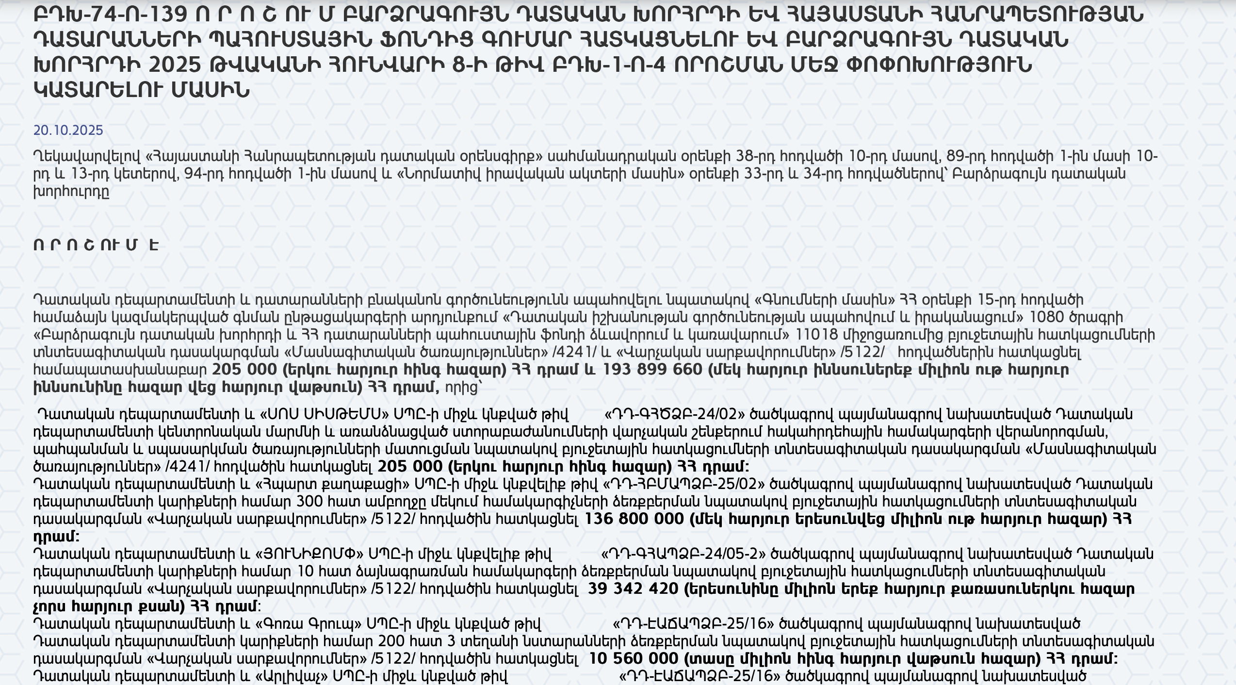 Iravaban.net–ը ուսումնասիրել է Բարձրագույն դատական խորհրդի թիվ ԲԴԽ-74-Ո-139 որոշումը, որով կարգավորվում է ԲԴԽ և ՀՀ դատարանների պահուստային ֆոնդից գումարների հատկացումը և կատարվում են փոփոխություններ ԲԴԽ 2025 թվականի հունվարի 8-ի թիվ ԲԴԽ-1-Ո-4 որոշման մեջ։