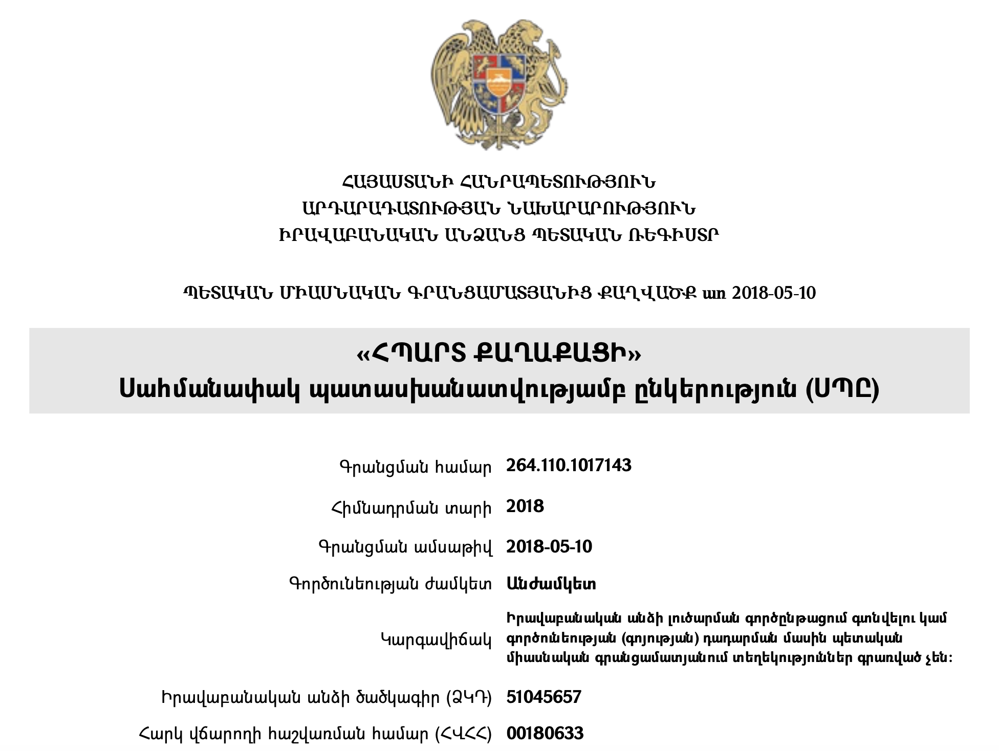 Iravaban.net–ը ուսումնասիրելով ԲԴԽ որոշման մեջ նշված «Հպարտ քաղաքացի» ՍՊԸ-ի տվյալները, պարզել է, որ ընկերությունը գրանցվել է 2018 թվականի մայիսի 10-ին: