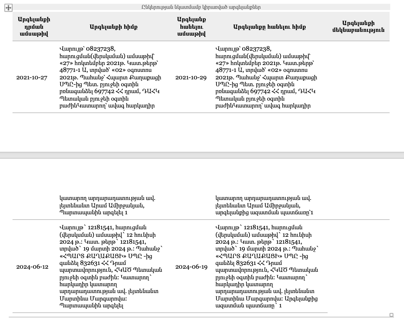 - 2021թ. հոկտեմբերի 27-ին՝ Վարույթ՝ 08237238, հարուցման (վերսկսման) ամսաթիվ՝ «27» հոկտեմբեր 2021թ., Կատ.թերթ՝ 48771-1 Ա, տրված՝ «02» օգոստոս 2021թ., Պետական բյուջեի օգտին 697,742 ՀՀ դրամի բռնագանձման պահանջով, որն արդեն հանվել է 2021թ. հոկտեմբերի 29-ին: