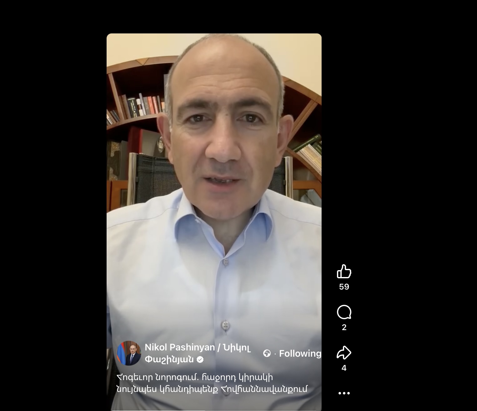 ՀՀ վարչապետ Նիկոլ Փաշինյանը իր սոցիալական էջում տեսանյութ է հրապարակել, որում կից գրել է. «Հոգեւոր նորոգում. հաջորդ կիրակի նույնպես կհանդիպենք Հովհաննավանքում»։