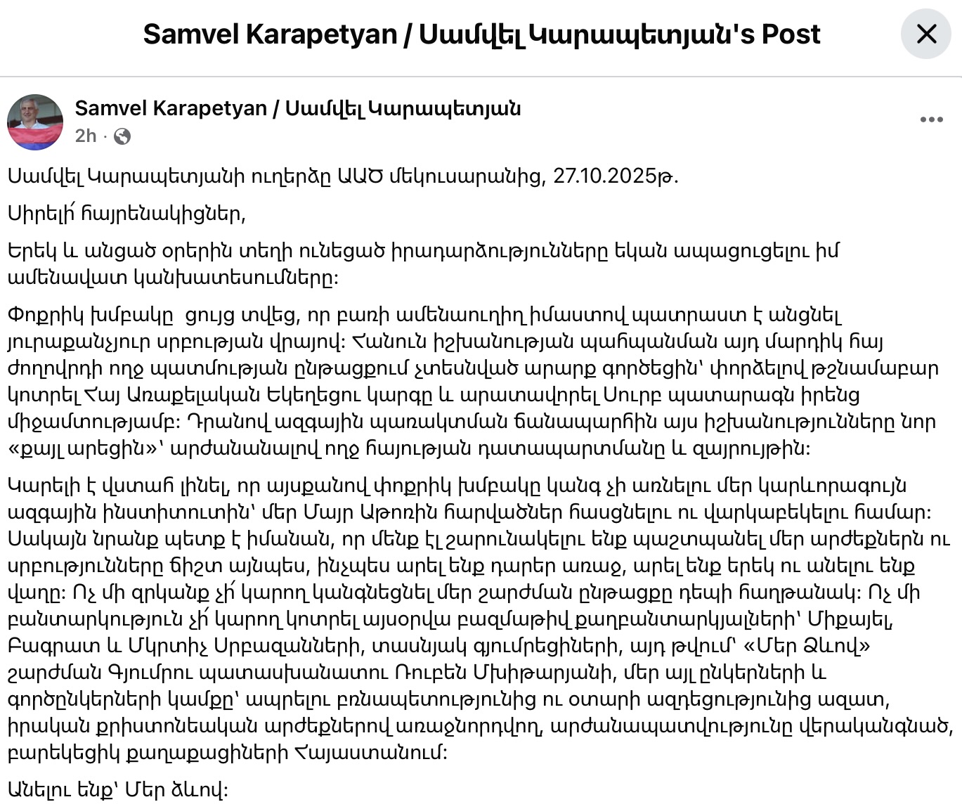 Իրավաբան.net-ը այդ մասին տեղեկանում է Սամվել Կարապետյան ֆեյսբուքյան էջից։ Ուղերձում, մասնավորապե՝ նշված է.